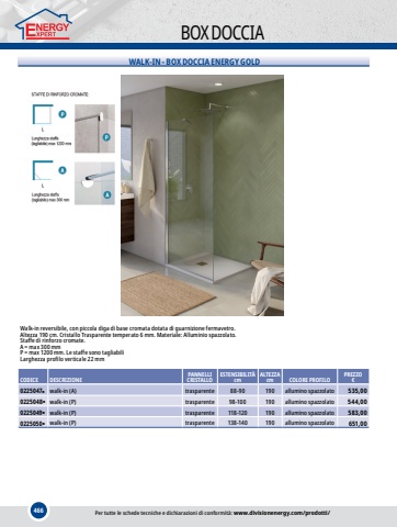466BOX DOCCIAWALK-IN - BOX DOCCIA ENERGY GOLDWalk-in reversibile, con piccola diga di base cromata dotata di guarnizione fermavetro.Altezza 190 cm. Cristallo Trasparente temperato 6 mm. Materiale: Alluminio spazzolato.Staffe di rinforzo cromate.A = max 300 mmP = max 1200 mm. Le staffe sono tagliabiliLarghezza profilo verticale 22 mmCODICEDESCRIZIONEPANNELLICRISTALLOESTENSIBILIT%u00c0cmALTEZZAcmCOLORE PROFILOPREZZO%u20ac0225047%u25cfwalk-in (A)trasparente88-90190allumino spazzolato535,000225048%u25cfwalk-in (P)trasparente98-100190allumino spazzolato544,000225049%u25cfwalk-in (P)trasparente118-120190allumino spazzolato583,000225050%u25cfwalk-in (P)trasparente138-140190allumino spazzolato651,00Per tutte le schede tecniche e dichiarazioni di conformit%u00e0: www.divisionenergy.com/prodotti/