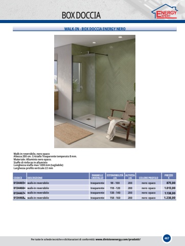 467BOX DOCCIAWALK-IN - BOX DOCCIA ENERGY NEROWalk-in reversibile, nero opacoAltezza 200 cm. Cristallo Trasparente temperato 8 mm.Materiale: Alluminio nero opaco.Staffe di rinforzo in alluminioLunghezza staffa max 1200 mm (tagliabile)Larghezza profilo verticale 22 mmCODICEDESCRIZIONEPANNELLICRISTALLOESTENSIBILIT%u00c0cmALTEZZAcmCOLORE PROFILOPREZZO%u20ac0134465%u25cfwalk-in reversibiletrasparente98 - 100200nero opaco875,000134466%u25cfwalk-in reversibiletrasparente118 - 120200nero opaco1.013,000134467%u25cfwalk-in reversibiletrasparente138 - 140200nero opaco1.138,000134468%u25cfwalk-in reversibiletrasparente158 - 160200nero opaco1.236,00Per tutte le schede tecniche e dichiarazioni di conformit%u00e0: www.divisionenergy.com/prodotti/