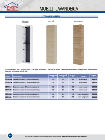 472MOBILI - LAVANDERIACOLONNA SOSPESAbianco matt acero campestre versione SXrovere nudeColonna sospesa con 2 ripiani in vetro e 1 in legno posizionato a met%u00e0 della colonna. L%u2019apertura dx o sx %u00e8 data dalla posizione della cerniera. Apertura con sistema push & pull.CODICEDESCRIZIONELARGHEZZAcmPROFONDIT%u00c0cmALTEZZAcmCOLOREPREZZO%u20ac0079500%u25cfColonna versione DX (cerniere a destra)3522150bianco matt588,000079501%u25cfColonna versione SX (cerniere a sinistra)3522150bianco matt588,000079504%u25cfColonna versione DX (cerniere a destra)3522150rovere nude588,000079505%u25cfColonna versione SX (cerniere a sinistra)3522150rovere nude588,000079502%u25cfColonna versione DX (cerniere a destra)3522150acero campestre588,000079503%u25cfColonna versione SX (cerniere a sinistra)3522150acero campestre588,00Per tutte le schede tecniche e dichiarazioni di conformit%u00e0: www.divisionenergy.com/prodotti/