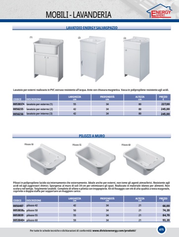475MOBILI - LAVANDERIALAVATOIO ENERGY SALVASPAZIO(1)(2)(3)Lavatoio per esterni realizzato in PVC estruso resistente all%u2019acqua. Ante con chiusura magnetica. Vasca in polipropilene resistente agli acidi.CODICEDESCRIZIONELARGHEZZAcmPROFONDIT%u00c0cmALTEZZAcmPREZZO%u20ac0053037%u25cflavatoio per esterno (1)553480227,000056235lavatoio per esterno (2)423480245,000056236lavatoio per interno (3)423480245,00PILOZZI A MUROPilozzo 50Pilozzo 55Pilozzo 60Pilozzi in polipropilene lucido sia internamente che esternamente. Ideale anche per esterni, non teme gli agenti atmosferici. Resistente agli acidi ed agli aggressori chimici. Sporgenza al muro di soli 34 cm per ottimizzare gli spazi. Realizzato in materiale idoneo per alimenti. Non scolora nel tempo. Totalmente lavabile. Completo di sifone e piletta con troppopieno. Kit di fissaggio con viti di alta qualit%u00e0 a testa esagonale, coprivite e doppia staffa per sopportare un maggiore carico.CODICEDESCRIZIONELARGHEZZAcmPROFONDIT%u00c0cmALTEZZAcmPREZZO%u20ac0056407pilozzo 4242342166,000053038%u25cfpilozzo 5050342174,200053039pilozzo 5555342184,700053040%u25cfpilozzo 6059342193,20Per tutte le schede tecniche e dichiarazioni di conformit%u00e0: www.divisionenergy.com/prodotti/