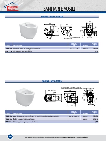 480SANITARI E AUSILISABINA - BIDET A TERRA37042022553035290280293955%u00d81515053035215565%u00d845%u00d835150200221000SCARICO DA 1\CODICEDESCRIZIONEMISURAcmCOLOREPREZZO%u20ac5244265%u25cfBidet filo muro,kit fissaggio non incluso.36 x 53 x h 42bianco283,000141553%u25cfKit fissaggio per vasi e bidet4,50SABINA - WC A TERRA420225352352120260175225170355120160310170125100370530100255SCARICO UNIFICATO TERRA O PARETE(con l'aggiunta di curva tecnica o raccordo dritto)CODICEDESCRIZIONEMISURAcmCOLOREPREZZO%u20ac5244264%u25cfVaso filo muro scarico unificato,kit per il fissaggio e sedile non inclusi.53 x 35,2 x H 42bianco283,005244268%u25cfSedile per vaso Sabina softclosebianco168,100141553%u25cfKit fissaggio in nylon per vasi e bidet4,50Per tutte le schede tecniche e dichiarazioni di conformit%u00e0: www.divisionenergy.com/prodotti/