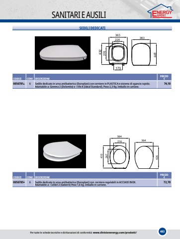 483SANITARI E AUSILISEDILI DEDICATI173432CODICECONF.DESCRIZIONEPREZZO%u20ac0056781%u25cf6Sedile dedicato in urea antibatterica (Duroplast) con cerniere in PLASTICA e sistema di sgancio rapido.Adattabile a: Gemma 2 (Dolomite) ei life A (Ideal Standard). Peso 2,3 Kg. Imballo in cartone.74,10364216410267364426CODICECONF.DESCRIZIONEPREZZO%u20ac0056785%u25cf6Sedilededicato in urea antibatterica (Duroplast) con cerniere regolabili in ACCIAIO INOX.Adattabile a:Colibr%u00ec 2 (Geberit)Peso 1,6 kg. Imballo in cartone.72,70Per tutte le schede tecniche e dichiarazioni di conformit%u00e0: www.divisionenergy.com/prodotti/