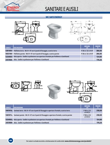 486SANITARI E AUSILIWC SAFE ENERGY48052045039045518010060555951604805552045039045557516095%u00d8100%u00d855CODICEDESCRIZIONEMISURAcmPREZZO%u20ac5391495%u25cfPolifemo terra - Wc H= 47 con 4 punti di fissaggio, scarico terraP 38 x L 52 x H 47286,005033146%u25cfPolifemoparete -Wc H= 47 con 4 punti di fissaggio, scarico pareteP 38 x L 52 x H 47286,005234905%u25cfKela aperto - Sedile in poliestere con apertura frontale per Polifemo e Sanithand124,805451908%u25cfKela - Sedile in poliestere per Polifemo e Sanithand178,2048060450520390580165%u00d85545590%u00d810048060520450455390180%u00d8100595160%u00d85515CODICEDESCRIZIONEMISURAcmPREZZO%u20ac5461410%u25cfSaniwat terra - Wc H= 47 con 4 punti di fissaggio e apertura frontale, scarico terraP 38 x L 52 x H 47,5250,005461411%u25cfSaniwat parete - Wc H= 47 con 4 punti di fissaggio e apertura frontale, scaricopareteP 38 x L 52 x H 47,5250,005234905%u25cfKela aperto - Sedile in poliestere con apertura frontale per Polifemo e Sanithand124,805451908%u25cfKela - Sedile in poliestere per Polifemo e Sanithand178,20Per tutte le schede tecniche e dichiarazioni di conformit%u00e0: www.divisionenergy.com/prodotti/