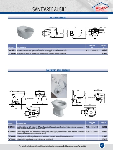 487SANITARI E AUSILIWC SAFE ENERGYCODICEDESCRIZIONEMISURAcmPREZZO%u20ac5461462%u25cfUP - Wc sospeso con apertura frontale, montaggio su staffa universaleP 37 x L 55 x H 37306,005234904%u25cfUP aperto - Sedile in poliestere con apertura frontale per wc/bidet UP124,80WC/BIDET SAFE ENERGY480520450385440%u00d825 ENTRATA BIDET5801659060%u00d8100%u00d855Ingresso acqua bidet %u00d8 25480520450385440185%u00d8100%u00d8 25 ENTRATA BIDET58016560%u00d855Ingresso acqua bidet %u00d8 25CODICEDESCRIZIONEMISURAcmPREZZO%u20ac5461412%u25cfSanithand terra - Wc-bidet H= 47 con 4 punti di fissaggio, con funzione bidet interna, completo di raccordo ad espansione, scarico terraP 38 x L 52 x H 47459,005234906%u25cfSanithandparete - Wc-bidet H= 47 con 4 punti di fissaggio, con funzione bidet interna, completo di raccordo ad espansione, scarico pareteP 38 x L 52 x H 47459,005234905%u25cfKela aperto - Sedile in poliestere con apertura frontale per Polifemo e Sanithand124,805451908%u25cfKela - Sedile in poliestere per Polifemo e Sanithand178,20Per tutte le schede tecniche e dichiarazioni di conformit%u00e0: www.divisionenergy.com/prodotti/