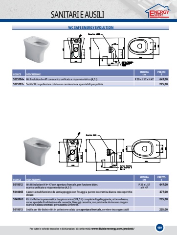 489SANITARI E AUSILIWC SAFE ENERGY EVOLUTION205205CODICEDESCRIZIONEMISURAcmPREZZO%u20ac5025194%u25cfWc Evolution h= 47 con scarico unificato a risparmio idrico (4,5 l)P 39 x L 57 x H 47647,005025197%u25cfSedile Wc in poliestere colato con cerniere inox sganciabili per pulizia225,00CODICEDESCRIZIONEMISURAcmPREZZO%u20ac5019312Wc H Evolution H h= 47 con apertura frontale, per funzione bidet,scarico unificato a risparmio idrico (4,5 l)P 39 x L 57 x H 47647,005040065Cassetta multifunzione da semiappoggio con fissaggi a parete in ceramica bianca con coperchio chiuso377,005040063Kit H - Batteria pneumatica doppio scarico (3/4,5 lt) completa di galleggiante, attacco basso, curva speciale di adduzione alla cassetta, fissaggi cassetta, con pulstante da incasso doppio scarico e placca cromati, per cassetta Orione H.265,005019313Sedile per Wc-bidet e Wc in poliestere colato con apertura frontale, cerniere inox sganciabili235,00Per tutte le schede tecniche e dichiarazioni di conformit%u00e0: www.divisionenergy.com/prodotti/