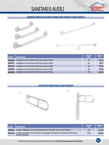 493SANITARI E AUSILIMANIGLIONI IN ACCIAIO VERNICIATO BIANCO SAFE ENERGYCODICEDESCRIZIONEMISURAcmPREZZO%u20ac0095422%u25cfmaniglione in acciaio bianco %u00d8 32 mm, portata 150 kg3040,760095421%u25cfmaniglione in acciaio bianco %u00d8 32 mm, portata 150 kg4548,110095423%u25cfmaniglione in acciaio bianco %u00d8 32 mm, portata 150 kg6053,300095424%u25cfmaniglione in acciaio bianco %u00d8 32 mm, portata 150 kg9076,500095425%u25cfmaniglione in acciaio bianco %u00d8 32 mm, portata 150 kg120147,20SOSTEGNI RIBALTABILI SAFE ENERGY12CODICEDESCRIZIONEMISURAcmPREZZO%u20ac0095419%u25cfsostegno ribaltabile con portarotolo bianco cm 701, %u00d8 32 mm, portata 125 kg (1)70121,700095420%u25cfsostegno ribaltabile con portarotolo e ancoraggio a pavimento in acciaio bianco %u00d8 32 mm,portata 125 kg (2)H 88334,00Per tutte le schede tecniche e dichiarazioni di conformit%u00e0: www.divisionenergy.com/prodotti/