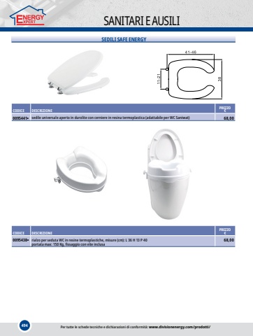 494SANITARI E AUSILISEDILI SAFE ENERGYCODICEDESCRIZIONEPREZZO%u20ac0095441%u25cfsedile universale aperto in durolite con cerniere in resina termoplastica (adattabile per WC Saniwat)68,00CODICEDESCRIZIONEPREZZO%u20ac0095438%u25cfrialzo per seduta WC in resine termoplastiche, misure (cm): L 36 H 13 P 40portata max: 150 Kg, fissaggio con vite inclusa68,00Per tutte le schede tecniche e dichiarazioni di conformit%u00e0: www.divisionenergy.com/prodotti/