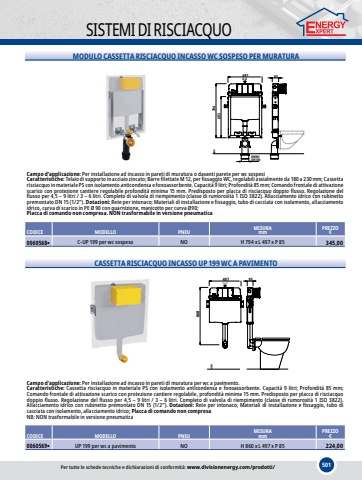 501SISTEMI DI RISCIACQUOMODULO CASSETTA RISCIACQUO INCASSO WC SOSPESO PER MURATURA79449785DN90/DN1000H2O603Campo d%u2019applicazione: Per installazione ad incasso in pareti di muratura o davanti parete per wc sospesiCaratteristiche: Telaio di supporto in acciaio zincato; Barre filettate M 12, per fissaggio WC, regolabili assialmente da 180 a 230 mm; Cassetta risciacquo in materiale PS con isolamento anticondensa e fonoassorbente. Capacit%u00e0 9 litri; Profondit%u00e0 85 mm; Comando frontale di attivazione scarico con protezione cantiere regolabile profondit%u00e0 minima 15 mm. Predisposto per placca di risciacquo doppio flusso. Regolazione del flusso per 4,5 %u2013 9 litri / 3 %u2013 6 litri. Completo di valvola di riempimento (classe di rumorosit%u00e0 1 ISO 3822). Allacciamento idrico con rubinetto premontato DN 15 (1/2%u201c). Dotazioni: Rete per intonaco; Materiali di installazione e fissaggio, tubo di cacciata con isolamento, allacciamento idrico, curva di scarico in PE %u00d8 90 con guarnizione, manicotto per curva %u00d890;Placca di comando non compresa.NON trasformabile in versione pneumaticaCODICEMODELLOPNEUMISURAmmPREZZO%u20ac0060568%u25cfC-UP 199 per wc sospesoNOH 794 x L 497 x P 85345,00CASSETTA RISCIACQUO INCASSO UP 199 WC A PAVIMENTO860497850H2OCampo d%u2019applicazione: Per installazione ad incasso in pareti di muratura per wc a pavimento.Caratteristiche: Cassetta risciacquo in materiale PS con isolamento anticondensa e fonoassorbente. Capacit%u00e0 9 litri; Profondit%u00e0 85 mm; Comando frontale di attivazione scarico con protezione cantiere regolabile, profondit%u00e0 minima 15 mm. Predisposto per placca di risciacquo doppio flusso. Regolazione del flusso per 4,5 %u2013 9 litri / 3 %u2013 6 litri. Completo di valvola di riempimento (classe di rumorosit%u00e0 1 ISO 3822). Allacciamento idrico con rubinetto premontato DN 15 (1/2%u201c). Dotazioni: Rete per intonaco; Materiali di installazione e fissaggio, tubo di cacciata con isolamento, allacciamento idrico; Placca di comando non compresaNB: NON trasformabile in versione pneumaticaCODICEMODELLOPNEUMISURAmmPREZZO%u20ac0060569%u25cfUP 199 per wc a pavimentoNOH 860 x L 497 x P 85224,00Per tutte le schede tecniche e dichiarazioni di conformit%u00e0: www.divisionenergy.com/prodotti/