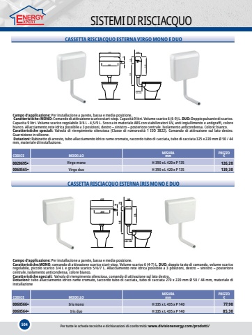 504SISTEMI DI RISCIACQUOCASSETTA RISCIACQUO ESTERNA VIRGO MONO E DUO10420330140-24039013559568Campo d%u2019applicazione: Per installazione a parete, bassa e media posizione. Caratteristiche: MONO: Comando di attivazione scarico start-stop.Capacit%u00e0 9 litri. Volume scarico 6 (6-9) L.DUO:Doppio pulsante di scarico. Capacita 9 litri. Volume scarico regolabile 3/6 L - 4,5/9 L. Scocca in materiale ABS con stabilizzatori UV, anti ingiallimento e antigraffi, colore bianco.Allacciamento rete idrica possibile a 3 posizioni, destro %u2013 sinistro %u2013 posteriore centrale. Isolamento anticondensa. Colore: bianco.Caratteristiche speciali: Valvola di riempimento silenziosa (Classe di rumorosit%u00e0 1 ISO 3822). Comando di attivazione sul lato destro. Guarnizione in silicone. Dotazioni: Rubinetto di arresto, tubo allacciamento idrico rame cromato, raccordo tubo di cacciata, tubo di cacciata 325 x 220 mm %u00d8 50 / 44 mm, materiale di installazione.CODICEMODELLOMISURAmmPREZZO%u20ac0020695%u25cfVirgo monoH 390 x L 420 x P 135126,200060565%u25cfVirgo duoH 390 x L 420 x P 135139,30CASSETTA RISCIACQUO ESTERNA IRIS MONO E DUO10435280140-24033514054570Campo d%u2019applicazione: Per installazione a parete, bassa e media posizione.Caratteristiche:MONO: comando di attivazione scarico start-stop, Volume scarico 6 (4-7) L. DUO: doppio tasto di comando, volume scarico regolabile, piccolo scarico 3/4 L e grande scarico 5/6/7 L. Allacciamento rete idrica possibile a 3 posizioni, destro %u2013 sinistro %u2013 posteriore centrale, isolamento anticondensa, colore bianco.Caratteristiche speciali: Valvola di riempimento silenziosa, comando di attivazione sul lato destro.Dotazioni:tubo allacciamento idrico rame cromato, taccordo tubo di cacciata, tubo di cacciata 270 x 220 mm %u00d8 50 / 44 mm, materiale di installazioneCODICEMODELLOMISURAmmPREZZO%u20ac0060566%u25cfIris monoH 335 x L 435 x P 14077,900060564%u25cfIris duoH 335 x L 435 x P 14085,30Per tutte le schede tecniche e dichiarazioni di conformit%u00e0: www.divisionenergy.com/prodotti/