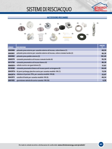 507SISTEMI DI RISCIACQUOACCESSORI/RICAMBI(6)(8)(3)(4)(7)(1)(5)(10)(9)(2)CODICEDESCRIZIONEPREZZO%u20ac0003980pulsante pneu esterno per cassette esterne ed incasso, colore bianco (1)48,300003981pulsante pneu esterno per cassette esterne ed incasso, colore cromato lucido (2)66,200003982pulsante pneu pedale esterno (3)161,400060570comando pneumatico ad incasso cromato lucido (4)93,500013738comando pneumatico ad incasso bianco (4)80,200060581%u25cfvalvola scarico con guarnizione (5)31,820010588comando pneumatico bianco ad incasso pareti cartongesso (6)84,400042972%u25cfkit perni prolunga placche scaricoper cassetta modello 199 (7)13,580042971%u25cfriduttore di portata 70%, per cassetta modello 199 (8)23,870042973cestello di fondo per cassetta modello 199 (9)40,340001955guarnizione valvola di scarico cassetta 199 (10)6,59Per tutte le schede tecniche e dichiarazioni di conformit%u00e0: www.divisionenergy.com/prodotti/