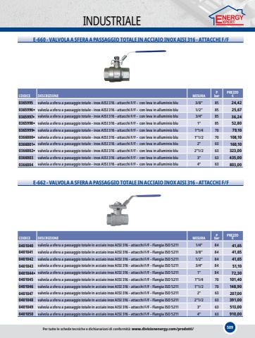 509INDUSTRIALEE-660 - VALVOLA A SFERA A PASSAGGIO TOTALE IN ACCIAIO INOX AISI 316 - ATTACCHI F/FCODICEDESCRIZIONEMISURAPbarPREZZO%u20ac0365995valvola a sfera a passaggio totale - inox AISI 316 - attacchi F/F - con leva in alluminio blu3/8%u201d8524,420365996%u25cfvalvola a sfera a passaggio totale - inox AISI 316 - attacchi F/F - con leva in alluminio blu1/2%u201d8525,670365997%u25cfvalvola a sfera a passaggio totale - inox AISI 316 - attacchi F/F - con leva in alluminio blu3/4%u201d8536,240365998%u25cfvalvola a sfera a passaggio totale - inox AISI 316 - attacchi F/F - con leva in alluminio blu1%u201d8552,800365999%u25cfvalvola a sfera a passaggio totale - inox AISI 316 - attacchi F/F - con leva in alluminio blu1%u201d1/47079,100366000%u25cfvalvola a sfera a passaggio totale - inox AISI 316 - attacchi F/F - con leva in alluminio blu1%u201d1/270108,100366001%u25cfvalvola a sfera a passaggio totale - inox AISI 316 - attacchi F/F - con leva in alluminio blu2%u201d63160,100366002%u25cfvalvola a sfera a passaggio totale - inox AISI 316 - attacchi F/F - con leva in alluminio blu2%u201d1/263323,000366003valvola a sfera a passaggio totale - inox AISI 316 - attacchi F/F - con leva in alluminio blu3%u201d63435,000366004valvola a sfera a passaggio totale - inox AISI 316 - attacchi F/F - con leva in alluminio blu4%u201d63803,00E-662 - VALVOLA A SFERA A PASSAGGIO TOTALE IN ACCIAIO INOX AISI 316 - ATTACCHI F/FCODICEDESCRIZIONEMISURAPbarPREZZO%u20ac0401040valvola a sfera a passaggio totale in acciaio inox AISI 316 - attacchi F/F - Flangia ISO 52111/4%u201d8441,650401041valvola a sfera a passaggio totale in acciaio inox AISI 316 - attacchi F/F - Flangia ISO 52113/8%u201d8441,650401042valvola a sfera a passaggio totale in acciaio inox AISI 316 - attacchi F/F - Flangia ISO 52111/2%u201d8441,650401043valvola a sfera a passaggio totale in acciaio inox AISI 316 - attacchi F/F - Flangia ISO 52113/4%u201d8451,100401044%u25cfvalvola a sfera a passaggio totale in acciaio inox AISI 316 - attacchi F/F - Flangia ISO 52111%u201d8472,300401045valvola a sfera a passaggio totale in acciaio inox AISI 316 - attacchi F/F - Flangia ISO 52111%u201d1/470101,400401046valvola a sfera a passaggio totale in acciaio inox AISI 316 - attacchi F/F - Flangia ISO 52111%u201d1/270148,900401047valvola a sfera a passaggio totale in acciaio inox AISI 316 - attacchi F/F - Flangia ISO 52112%u201d63207,000401048valvola a sfera a passaggio totale in acciaio inox AISI 316 - attacchi F/F - Flangia ISO 52112%u201d1/263391,000401049valvola a sfera a passaggio totale in acciaio inox AISI 316 - attacchi F/F - Flangia ISO 52113%u201d63513,000401050valvola a sfera a passaggio totale in acciaio inox AISI 316 - attacchi F/F - Flangia ISO 52114%u201d63910,00Per tutte le schede tecniche e dichiarazioni di conformit%u00e0: www.divisionenergy.com/prodotti/
