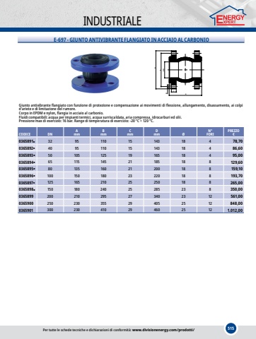 515INDUSTRIALEE-697 - GIUNTO ANTIVIBRANTE FLANGIATO IN ACCIAIO AL CARBONIODN BA%u00d8 CDGiunto antivibrante flangiato con funzione di protezione e compensazione ai movimenti di flessione, allungamento, disassamento, ai colpi d%u2019ariete e di limitazione del rumore.Corpo in EPDM e nylon, flangia in acciaio al carbonio.Fluidi compatibili: acqua per impianti termici, acqua surriscaldata, aria compressa, idrocarburi ed olii.Pressione max di esercizio: 16 bar. Range di temperatura di esercizio: -20 %u00b0C %u00f7 120 %u00b0C.CODICEDNAmmBmmCmmDmm%u00d8N%u00b0FORIPREZZO%u20ac0365891%u25cf32951101514318478,700365892%u25cf40951101514318486,600365893%u25cf501051251916518495,000365894%u25cf6511514521185188129,600365895%u25cf8013516021200188159,100365896%u25cf10015018023220188193,700365897%u25cf12516521025250188265,000365898%u25cf15018024025285238350,000365899200210295273402312561,000365900250230355294052512848,0003659013002304102946025121.012,00Per tutte le schede tecniche e dichiarazioni di conformit%u00e0: www.divisionenergy.com/prodotti/