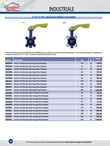 526INDUSTRIALEE-177 / E-178 - VALVOLA A FARFALLA IN GHISALugWaferValvola a farfalla in ghisa GJS 400 tipo LUG o WAFER per gas, adatte per impianti di distribuzione gas a media e bassa pressione. Temperatura massima di esercizio: -12%u00b0C + 82%u00b0C. Pressione massima di esercizio: 16 bar.CODICEDESCRIZIONEDNPbarPREZZO%u20ac0365845%u25cfvalvola a farfalla tipo lug Energy Ghisa flangiata4016149,300365846%u25cfvalvola a farfalla tipo lug Energy Ghisa flangiata5016157,100365847valvola a farfalla tipo lug Energy Ghisa flangiata6516184,100365848%u25cfvalvola a farfalla tipo lug Energy Ghisa flangiata8016198,200365849%u25cfvalvola a farfalla tipo lug Energy Ghisa flangiata10016289,000365850%u25cfvalvola a farfalla tipo lug Energy Ghisa flangiata12516386,000365851%u25cfvalvola a farfalla tipo lug Energy Ghisa flangiata15016440,000365852valvola a farfalla tipo lug Energy Ghisa flangiata20016735,000365853valvola a farfalla tipo lug Energy Ghisa flangiata250161.016,000365854valvola a farfalla tipo lug Energy Ghisa flangiata300161.628,000365855%u25cfvalvola a farfalla tipo wafer Energy Ghisa flangiata4016135,700365856valvola a farfalla tipo wafer Energy Ghisa flangiata5016141,800365857%u25cfvalvola a farfalla tipo wafer Energy Ghisa flangiata6516165,000365858%u25cfvalvola a farfalla tipo wafer Energy Ghisa flangiata8016177,400365859%u25cfvalvola a farfalla tipo wafer Energy Ghisa flangiata10016261,000365860valvola a farfalla tipo wafer Energy Ghisa flangiata12516348,000365861valvola a farfalla tipo wafer Energy Ghisa flangiata15016398,000365862valvola a farfalla tipo wafer Energy Ghisa flangiata20016668,000365863valvola a farfalla tipo wafer Energy Ghisa flangiata25016926,000365864valvola a farfalla tipo wafer Energy Ghisa flangiata300161.486,00Per tutte le schede tecniche e dichiarazioni di conformit%u00e0: www.divisionenergy.com/prodotti/