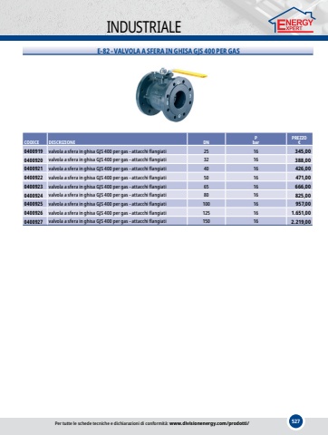527INDUSTRIALEE-82 - VALVOLA A SFERA IN GHISA GJS 400 PER GASCODICEDESCRIZIONEDNPbarPREZZO%u20ac0400919valvola a sfera in ghisa GJS 400 per gas - attacchi flangiati2516345,000400920valvola a sfera in ghisa GJS 400 per gas - attacchi flangiati3216388,000400921valvola a sfera in ghisa GJS 400 per gas - attacchi flangiati4016426,000400922valvola a sfera in ghisa GJS 400 per gas - attacchi flangiati5016471,000400923valvola a sfera in ghisa GJS 400 per gas - attacchi flangiati6516666,000400924valvola a sfera in ghisa GJS 400 per gas - attacchi flangiati8016825,000400925valvola a sfera in ghisa GJS 400 per gas - attacchi flangiati10016957,000400926valvola a sfera in ghisa GJS 400 per gas - attacchi flangiati125161.651,000400927valvola a sfera in ghisa GJS 400 per gas - attacchi flangiati150162.219,00Per tutte le schede tecniche e dichiarazioni di conformit%u00e0: www.divisionenergy.com/prodotti/
