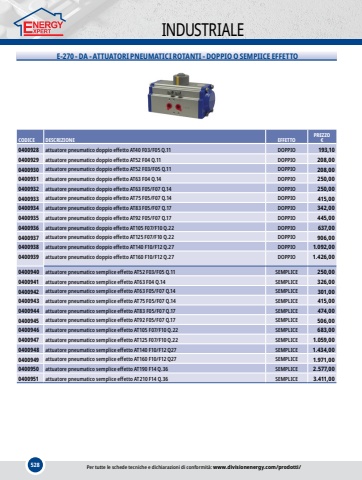528INDUSTRIALEE-270 - DA - ATTUATORI PNEUMATICI ROTANTI - DOPPIO O SEMPIICE EFFETTOCODICEDESCRIZIONEEFFETTOPREZZO%u20ac0400928attuatore pneumatico doppio effetto AT40 F03/F05 Q.11DOPPIO193,100400929attuatore pneumatico doppio effetto AT52 F04 Q.11DOPPIO208,000400930attuatore pneumatico doppio effetto AT52 F03/F05 Q.11DOPPIO208,000400931attuatore pneumatico doppio effetto AT63 F04 Q.14DOPPIO250,000400932attuatore pneumatico doppio effetto AT63 F05/F07 Q.14DOPPIO250,000400933attuatore pneumatico doppio effetto AT75 F05/F07 Q.14DOPPIO415,000400934attuatore pneumatico doppio effetto AT83 F05/F07 Q.17DOPPIO342,000400935attuatore pneumatico doppio effetto AT92 F05/F07 Q.17DOPPIO445,000400936attuatore pneumatico doppio effetto AT105 F07/F10 Q.22DOPPIO637,000400937attuatore pneumatico doppio effetto AT125 F07/F10 Q.22DOPPIO906,000400938attuatore pneumatico doppio effetto AT140 F10/F12 Q.27DOPPIO1.092,000400939attuatore pneumatico doppio effetto AT160 F10/F12 Q.27DOPPIO1.426,000400940attuatore pneumatico semplice effetto AT52 F03/F05 Q.11SEMPLICE250,000400941attuatore pneumatico semplice effetto AT63 F04 Q.14SEMPLICE326,000400942attuatore pneumatico semplice effetto AT63 F05/F07 Q.14SEMPLICE301,000400943attuatore pneumatico semplice effetto AT75 F05/F07 Q.14SEMPLICE415,000400944attuatore pneumatico semplice effetto AT83 F05/F07 Q.17SEMPLICE474,000400945attuatore pneumatico semplice effetto AT92 F05/F07 Q.17SEMPLICE506,000400946attuatore pneumatico semplice effetto AT105 F07/F10 Q.22SEMPLICE683,000400947attuatore pneumatico semplice effetto AT125 F07/F10 Q.22SEMPLICE1.059,000400948attuatore pneumatico semplice effetto AT140 F10/F12 Q27SEMPLICE1.434,000400949attuatore pneumatico semplice effetto AT160 F10/F12 Q27SEMPLICE1.971,000400950attuatore pneumatico semplice effetto AT190 F14 Q.36SEMPLICE2.577,000400951attuatore pneumatico semplice effetto AT210 F14 Q.36SEMPLICE3.411,00Per tutte le schede tecniche e dichiarazioni di conformit%u00e0: www.divisionenergy.com/prodotti/