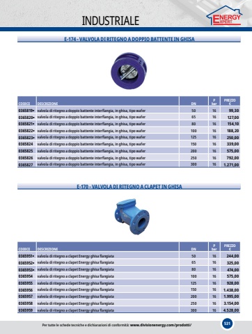 531INDUSTRIALEE-174 - VALVOLA DI RITEGNO A DOPPIO BATTENTE IN GHISACODICEDESCRIZIONEDNPbarPREZZO%u20ac0365819%u25cfvalvola di ritegno a doppio battente interflangia, in ghisa, tipo wafer501699,300365820%u25cfvalvola di ritegno a doppio battente interflangia, in ghisa, tipo wafer6516127,000365821%u25cfvalvola di ritegno a doppio battente interflangia, in ghisa, tipo wafer8016154,100365822%u25cfvalvola di ritegno a doppio battente interflangia, in ghisa, tipo wafer10016188,200365823%u25cfvalvola di ritegno a doppio battente interflangia, in ghisa, tipo wafer12516250,000365824valvola di ritegno a doppio battente interflangia, in ghisa, tipo wafer15016339,000365825valvola di ritegno a doppio battente interflangia, in ghisa, tipo wafer20016575,000365826valvola di ritegno a doppio battente interflangia, in ghisa, tipo wafer25016792,000365827valvola di ritegno a doppio battente interflangia, in ghisa, tipo wafer300161.271,00E-170 - VALVOLA DI RITEGNO A CLAPET IN GHISACODICEDESCRIZIONEDNPbarPREZZO%u20ac0365951%u25cfvalvola di ritegno a clapet Energy ghisa flangiata5016244,000365952%u25cfvalvola di ritegno a clapet Energy ghisa flangiata6516325,000365953%u25cfvalvola di ritegno a clapet Energy ghisa flangiata8016474,000365954valvola di ritegno a clapet Energy ghisa flangiata10016575,000365955valvola di ritegno a clapet Energy ghisa flangiata12516928,000365956valvola di ritegno a clapet Energy ghisa flangiata150161.438,000365957valvola di ritegno a clapet Energy ghisa flangiata200161.995,000365958valvola di ritegno a clapet Energy ghisa flangiata250163.154,000365959valvola di ritegno a clapet Energy ghisa flangiata300164.528,00Per tutte le schede tecniche e dichiarazioni di conformit%u00e0: www.divisionenergy.com/prodotti/