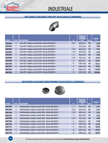 536INDUSTRIALERACCORDO A SALDARE CURVA 90%u00b0 IN ACCIAIO AL CARBONIOCODICECONF.DESCRIZIONE%u00d8DIAMETRO ESTERNO X SPESSOREmmU.M.PREZZO%u20ac0301693%u25cf1Curva 90%u00b0 a saldare, acciaio S235 - Norma EN 10253-13/426,9 x 2,3NR4,390301694%u25cf1Curva 90%u00b0 a saldare, acciaio S235 - Norma EN 10253-1133,7 x 2,6NR3,960301695%u25cf1Curva 90%u00b0 a saldare, acciaio S235 - Norma EN 10253-11 1/442,4 x 2,6NR4,910301696%u25cf1Curva 90%u00b0 a saldare, acciaio S235 - Norma EN 10253-11 1/248,3 x 2,6NR5,960301697%u25cf1Curva 90%u00b0 a saldare, acciaio S235 - Norma EN 10253-1260,3 x 2,9NR9,500301698%u25cf1Curva 90%u00b0 a saldare, acciaio S235 - Norma EN 10253-12 1/276,1 x 2,9NR14,820301699%u25cf1Curva 90%u00b0 a saldare, acciaio S235 - Norma EN 10253-1388,9 x 3,2NR22,610301700%u25cf1Curva 90%u00b0 a saldare, acciaio S235 - Norma EN 10253-14114,3 x 3,6NR43,210301701%u25cf1Curva 90%u00b0 a saldare, acciaio S235 - Norma EN 10253-15139,7 x 4,0NR74,200301702%u25cf1Curva 90%u00b0 a saldare, acciaio S235 - Norma EN 10253-16168,3 x 4,5NR116,300301703%u25cf1Curva 90%u00b0 a saldare, acciaio S235 - Norma EN 10253-18219,1 x 6,3NR293,00RACCORDO A SALDARE FONDI BOMBATI IN ACCIAIO AL CARBONIOCODICECONF.DESCRIZIONE%u00d8DIAMETRO ESTERNO X SPESSOREmmU.M.PREZZO%u20ac0301704%u25cf1Fondi bombati a saldare, acciaio S235 -Norma EN 10253-1133,7 x 2,6NR2,270301705%u25cf1Fondi bombati a saldare, acciaio S235 -Norma EN 10253-11 1/442,4 x 2,6NR2,410301706%u25cf1Fondi bombati a saldare, acciaio S235 -Norma EN 10253-11 1/248,3 x 2,6NR2,530301707%u25cf1Fondi bombati a saldare, acciaio S235 -Norma EN 10253-1260,3 x 2,9NR3,070301708%u25cf1Fondi bombati a saldare, acciaio S235 -Norma EN 10253-12 1/276,1 x 2,9NR4,930301709%u25cf1Fondi bombati a saldare, acciaio S235 -Norma EN 10253-1388,9 x 3,2NR5,990301710%u25cf1Fondi bombati a saldare, acciaio S235 -Norma EN 10253-14114,3 x 3,6NR17,320301711%u25cf1Fondi bombati a saldare, acciaio S235 -Norma EN 10253-15139,7 x 4,0NR25,050301712%u25cf1Fondi bombati a saldare, acciaio S235 -Norma EN 10253-16168,3 x 4,5NR45,560301713%u25cf1Fondi bombati a saldare, acciaio S235 -Norma EN 10253-18219,1 x 6,3NR85,70Per tutte le schede tecniche e dichiarazioni di conformit%u00e0: www.divisionenergy.com/prodotti/