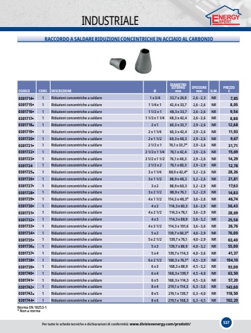 537INDUSTRIALERACCORDO A SALDARE RIDUZIONI CONCENTRICHE IN ACCIAIO AL CARBONIOCODICECONF.DESCRIZIONE%u00d8DIAMETRO ESTERNOmmSPESSOREmmU.M.PREZZO%u20ac0301714%u25cf1Riduzioni concentriche a saldare1 x 3/433,7 x 26,92,6 - 2,3NR7,850301715%u25cf1Riduzioni concentriche a saldare1 1/4 x 142,4 x 33,72,6 - 2,6NR8,050301716%u25cf1Riduzioni concentriche a saldare1 1/2 x 148,3 x 33,72,6 - 2,6NR9,560301717%u25cf1Riduzioni concentriche a saldare1 1/2 x 1 1/448,3 x 42,42,6 - 2,6NR8,800301718%u25cf1Riduzioni concentriche a saldare2 x 160,3 x 33,72,9 - 2,6NR12,680301719%u25cf1Riduzioni concentriche a saldare2 x 1 1/460,3 x 42,42,9 - 2,6NR11,930301720%u25cf1Riduzioni concentriche a saldare2 x 1 1/260,3 x 48,32,9 - 2,6NR9,670301721%u25cf1Riduzioni concentriche a saldare2 1/2 x 176,1 x 33,7*2,9 - 2,6NR31,710301722%u25cf1Riduzioni concentriche a saldare2 1/2 x 1 1/476,1 x 42,42,9 - 2,6NR15,690301723%u25cf1Riduzioni concentriche a saldare2 1/2 x 1 1/276,1 x 48,32,9 - 2,6NR14,2903017241Riduzioni concentriche a saldare2 1/2 x 276,1 x 60,32,9 - 2,9NR12,780301725%u25cf1Riduzioni concentriche a saldare3 x 1 1/488,9 x 42,4*3,2 - 2,6NR28,260301726%u25cf1Riduzioni concentriche a saldare3 x 1 1/288,9 x 48,33,2 - 2,6NR21,810301727%u25cf1Riduzioni concentriche a saldare3 x 288,9 x 60,33,2 - 2,9NR17,630301728%u25cf1Riduzioni concentriche a saldare3 x 2 1/288,9 x 76,13,2 - 2,9NR14,830301729%u25cf1Riduzioni concentriche a saldare4 x 1 1/2114,3 x 48,3*3,6 - 2,6NR46,740301730%u25cf1Riduzioni concentriche a saldare4 x 2114,3 x 60,33,6 - 2,9NR36,430301731%u25cf1Riduzioni concentriche a saldare4 x 2 1/2114,3 x 76,13,6 - 2,9NR28,690301732%u25cf1Riduzioni concentriche a saldare4 x 3114,3 x 88,93,6 - 3,2NR25,580301733%u25cf1Riduzioni concentriche a saldare4 x 3 1/2114,3 x 101,63,6 - 3,6NR26,760301734%u25cf1Riduzioni concentriche a saldare5 x 2139,7 x 60,3*4,0 - 2,9NR76,000301735%u25cf1Riduzioni concentriche a saldare5 x 2 1/2139,7 x 76,14,0 - 2,9NR63,400301736%u25cf1Riduzioni concentriche a saldare5 x 3139,7 x 88,94,0 - 3,2NR55,000301737%u25cf1Riduzioni concentriche a saldare5 x 4139,7 x 114,34,0 - 3,6NR41,370301738%u25cf1Riduzioni concentriche a saldare6 x 2 1/2168,3 x 76,1*4,5 - 2,9NR104,100301739%u25cf1Riduzioni concentriche a saldare6 x 3168,3 x 88,94,5 - 3,2NR93,000301740%u25cf1Riduzioni concentriche a saldare6 x 4168,3 x 139,74,5 - 4,0NR63,500301741%u25cf1Riduzioni concentriche a saldare6 x 5168,3 x 114,34,5 - 3,6NR57,200301742%u25cf1Riduzioni concentriche a saldare8 x 4219,1 x 114,36,3 - 3,6NR143,600301743%u25cf1Riduzioni concentriche a saldare8 x 5219,1 x 139,76,3 - 4,0NR118,500301744%u25cf1Riduzioni concentriche a saldare8 x 6219,1 x 168,36,3 - 4,5NR102,20Norma EN 10253-1* Non a normaPer tutte le schede tecniche e dichiarazioni di conformit%u00e0: www.divisionenergy.com/prodotti/