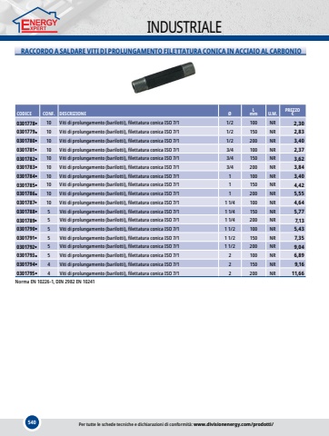 540INDUSTRIALERACCORDO A SALDARE VITI DI PROLUNGAMENTO FILETTATURA CONICA IN ACCIAIO AL CARBONIOCODICECONF.DESCRIZIONE%u00d8LmmU.M.PREZZO%u20ac0301778%u25cf10Viti di prolungamento (barilotti), filettatura conica ISO 7/11/2100NR2,300301779%u25cf10Viti di prolungamento (barilotti), filettatura conica ISO 7/11/2150NR2,830301780%u25cf10Viti di prolungamento (barilotti), filettatura conica ISO 7/11/2200NR3,400301781%u25cf10Viti di prolungamento (barilotti), filettatura conica ISO 7/13/4100NR2,370301782%u25cf10Viti di prolungamento (barilotti), filettatura conica ISO 7/13/4150NR3,620301783%u25cf10Viti di prolungamento (barilotti), filettatura conica ISO 7/13/4200NR3,840301784%u25cf10Viti di prolungamento (barilotti), filettatura conica ISO 7/11100NR3,400301785%u25cf10Viti di prolungamento (barilotti), filettatura conica ISO 7/11150NR4,420301786%u25cf10Viti di prolungamento (barilotti), filettatura conica ISO 7/11200NR5,550301787%u25cf10Viti di prolungamento (barilotti), filettatura conica ISO 7/11 1/4100NR4,640301788%u25cf5Viti di prolungamento (barilotti), filettatura conica ISO 7/11 1/4150NR5,770301789%u25cf5Viti di prolungamento (barilotti), filettatura conica ISO 7/11 1/4200NR7,130301790%u25cf5Viti di prolungamento (barilotti), filettatura conica ISO 7/11 1/2100NR5,430301791%u25cf5Viti di prolungamento (barilotti), filettatura conica ISO 7/11 1/2150NR7,350301792%u25cf5Viti di prolungamento (barilotti), filettatura conica ISO 7/11 1/2200NR9,040301793%u25cf5Viti di prolungamento (barilotti), filettatura conica ISO 7/12100NR6,890301794%u25cf4Viti di prolungamento (barilotti), filettatura conica ISO 7/12150NR9,160301795%u25cf4Viti di prolungamento (barilotti), filettatura conica ISO 7/12200NR11,66Norma EN 10226-1, DIN 2982 EN 10241Per tutte le schede tecniche e dichiarazioni di conformit%u00e0: www.divisionenergy.com/prodotti/