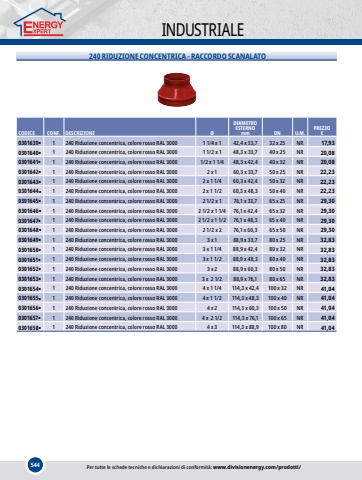 544INDUSTRIALE240 RIDUZIONE CONCENTRICA - RACCORDO SCANALATOCODICECONF.DESCRIZIONE%u00d8DIAMETRO ESTERNOmmDNU.M.PREZZO%u20ac0301639%u25cf1240 Riduzione concentrica, colore rosso RAL 30001 1/4 x 142,4 x 33,732 x 25NR17,930301640%u25cf1240 Riduzione concentrica, colore rosso RAL 30001 1/2 x 148,3 x 33,740 x 25NR20,080301641%u25cf1240 Riduzione concentrica, colore rosso RAL 30001/2 x 1 1/448,3 x 42,440 x 32NR20,080301642%u25cf1240 Riduzione concentrica, colore rosso RAL 30002 x 160,3 x 33,750 x 25NR22,230301643%u25cf1240 Riduzione concentrica, colore rosso RAL 30002 x 1 1/460,3 x 42,450 x 32NR22,230301644%u25cf1240 Riduzione concentrica, colore rosso RAL 30002 x 1 1/260,3 x 48,350 x 40NR22,230301645%u25cf1240 Riduzione concentrica, colore rosso RAL 30002 1/2 x 176,1 x 33,765 x 25NR29,300301646%u25cf1240 Riduzione concentrica, colore rosso RAL 30002 1/2 x 1 1/476,1 x 42,465 x 32NR29,300301647%u25cf1240 Riduzione concentrica, colore rosso RAL 30002 1/2 x 1 1/276,1 x 48,365 x 40NR29,300301648%u25cf1240 Riduzione concentrica, colore rosso RAL 30002 1/2 x 276,1 x 60,365 x 50NR29,300301649%u25cf1240 Riduzione concentrica, colore rosso RAL 30003 x 188,9 x 33,780 x 25NR32,830301650%u25cf1240 Riduzione concentrica, colore rosso RAL 30003 x 1 1/488,9 x 42,480 x 32NR32,830301651%u25cf1240 Riduzione concentrica, colore rosso RAL 30003 x 1 1/288,9 x 48,380 x 40NR32,830301652%u25cf1240 Riduzione concentrica, colore rosso RAL 30003 x 288,9 x 60,380 x 50NR32,830301653%u25cf1240 Riduzione concentrica, colore rosso RAL 30003 x 2 1/288,9 x 76,180 x 65NR32,830301654%u25cf1240 Riduzione concentrica, colore rosso RAL 30004 x 1 1/4114,3 x 42,4100 x 32NR41,040301655%u25cf1240 Riduzione concentrica, colore rosso RAL 30004 x 1 1/2114,3 x 48,3100 x 40NR41,040301656%u25cf1240 Riduzione concentrica, colore rosso RAL 30004 x 2114,3 x 60,3100 x 50NR41,040301657%u25cf1240 Riduzione concentrica, colore rosso RAL 30004 x 2 1/2114,3 x 76,1100 x 65NR41,040301658%u25cf1240 Riduzione concentrica, colore rosso RAL 30004 x 3114,3 x 88,9100 x 80NR41,04Per tutte le schede tecniche e dichiarazioni di conformit%u00e0: www.divisionenergy.com/prodotti/