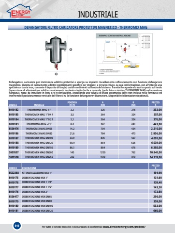 546INDUSTRIALEDEFANGATORE FILTRO CARICATORE PROTETTIVI MAGNETICO - THERMOMIX MAGESEMPIO SCHEMA INSTALLAZIONE 1CALDAIA A CONDENSAZIONE2 NEUTROAA - NEUTRALIZZATORE DI CONDENSA3 CARICATORE-DEFANGATORE THERMOMIX4 SCARICOINOUT12443Defangatore, caricatore per immissione additivi-protettivi e spurgo su impianti riscaldamento raffrescamento con funzione defangatore magnetico. Sistema di caricamento additivi condizionanti specifico per impianti a circuito chiuso. La sua conformazione, con all%u2019interno una speciale cartuccia inox, consente il deposito di fanghi, ossidi e sedimenti sul fondo del sistema. Tramite il magnete e lo scarico posto sul fondo l%u2019operazione di eliminazione solidi e svuotamento impianto risulta facile e comoda. (nella foto a sinistra THERMOMIX MAG nella versione flangiata). Nota: da installare in linea e/o in derivazione. Installando una valvola di sfiato automatica jolly (non inclusa nella fornitura) ed invertendo il posizionamento verticale del filtro si ha la funzione defangatore+disareatore. Disponibile coibentazione (optional).CODICEMODELLOPORTATAm%u00b3/hAmmBmmPREZZO%u20ac8010182THERMOMIX MAG 1 F2,2325276332,008010185THERMOMIX MAG 1%u201d1/4 F3,5364324357,008010184THERMOMIX MAG 1%u201d1/2 F5,1364324376,008010183THERMOMIX MAG 2%u201d F8,4407381443,008536476THERMOMIX MAG DN6514,27044342.210,008010186THERMOMIX MAG DN8021,67844732.806,008010187THERMOMIX MAG DN10033,98355274.091,008010188THERMOMIX MAG DN12558,98846256.039,008010189THERMOMIX MAG DN15086,18846766.302,005009597THERMOMIX MAG DN200145125076210.841,005009598THERMOMIX MAG DN250232151087014.319,00CODICEDESCRIZIONEPREZZO%u20ac8522368KIT INSTALLAZIONE MIX 1%u201d194,908010175COIBENTAZIONE MIX 1%u201d131,608010178COIBENTAZIONE MIX 1 1/4%u201d139,408010177COIBENTAZIONE MIX 1 1/2%u201d143,308010176COIBENTAZIONE MIX 2%u201d172,508536477COIBENTAZIONE MIX DN65296,008010179COIBENTAZIONE MIX DN80359,008010180COIBENTAZIONE MIX DN100532,008010181COIBENTAZIONE MIX DN125660,00Per tutte le schede tecniche e dichiarazioni di conformit%u00e0: www.divisionenergy.com/prodotti/