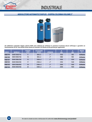 552INDUSTRIALEADDOLCITORI AUTOMATICI DUPLEX %u2013 DOPPIA COLONNA VOLUME 2%u201dGli addolcitori automatici doppia colonna DVAF sono utilizzati per eliminare la presenza di durezza-calcare nell%u2019acqua e garantire un funzionamento 24/24. Sono dotati di due valvole di comando e di valvola ad alta portata per applicazioniCODICEMODELLOPORTATAm%u00b3/hCICLICA MAXm%u00b3x%u00b0FrATTACCHI%u00d8mmHmmPREZZO%u20ac0362119DVAF/2900/1159690 x 22%u201d1550940richiesta0362120DVAF/2900/15010900 x 22%u201d1880940richiesta0362121DVAF/2900/250151500 x 22%u201d19501250richiesta0362122DVAF/2900/350172100 x 22%u201d21501320richiesta0362123DVAF/2900/450182700 x 22%u201d25001500richiesta0362124DVAF/2900/550203300 x 22%u201d24001500richiestaPer tutte le schede tecniche e dichiarazioni di conformit%u00e0: www.divisionenergy.com/prodotti/
