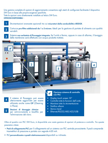 Opzione sistema di controlloDisplay touch screen 10%u201dControlla tutte le funzioni dell%u2019unit%u00e0 %u2022Monitora tutta la strumentazione%u2022Notifica allarmi%u2022Storico trend%u2022Ethernet/RS232/485/422/USB:Strumentazioni avanzate opzionali tra cui misuratori della conducibilit%u00e0 e REDOX.Cartucce pre-filtro addizionali da 1 e 5 micron.Ideali per la gestione di portate di alimento con qualit%u00e0variabili.Sistema con serbatoio di flussaggio integrato.. Se l%u2019unit%u00e0 si ferma, oppure in caso di allarme, il lavaggio delle membrane sar%u00e0 effettuato con acqua prodotta trattata.stemapu%u00f2 esseteriormente aggiornato per esseutizzato anchecomeCIP(Cleaning in ace).Stazioni di dosaggio chimicoper anti-incrostante e bisolfito per l%u2019eliminazione del cloro.%u2022 Pack di collegamento PLCper il collegamento ad un sistema con PLC centrale pre-esistente. Il pack comprende trasmettitori di pressione e portata con segnale 4-20 mA. personalizzato e quadri elettromeccanicidisponibili su richiesta.3Opzione sistema di controllocon PLC %u2022Display touch screen 10%u201d%u2022Controlla tutte le funzioni dell%u2019unit%u00e0%u2022Monitora tutta la strumentazione%u2022Notifica allarmi%u2022Storico trend%u2022Ethernet/RS232/485/422/USBUna gamma completa di opzioni di aggiornamento consentono agli utenti di configurare facilmente il dispositivo SW Euro in base alle proprie esigenze specifiche. Tutte le opzioni sono direttamente installate sul telaio SW Euro.OPZIONI DISPONIBILI:Strumentazioni avanzate opzionali tra cui misuratori della conducibilit%u00e0 e REDOX.Cartucce pre-filtro addizionali da 1 e 5 micron. Ideali per la gestione di portate di alimento con qualit%u00e0 variabili.Sistema con serbatoio di flussaggio integrato.. Se l%u2019unit%u00e0 si ferma, oppure in caso di allarme, il lavaggio delle membrane sar%u00e0 effettuato con acqua prodotta trattata.Il sistema di flussaggio pu%u00f2essere ulteriormenteaggiornatoperessere utilizzatoanche come CIP(Cleaning in Place).Stazioni di dosaggio chimicoper anti-incrostante e bisolfito per l%u2019eliminazione del cloro.Oltre al quadro con PLC SW Euro, %u00e8 disponibile una vasta gamma di opzioni di potenza e controllo. Tra queste possiamo citare:%u2022 Pack di collegamento PLC per il collegamento ad un sistema con PLC centrale pre-esistente. Il pack comprendetrasmettitori di pressione e portata con segnale 4-20 mA.%u2022 PLC personalizzato e quadri elettromeccanici disponibili su richiesta.31223344553