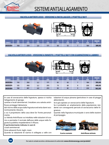 566SISTEMI ANTIALLAGAMENTOVALVOLA ANTIRIFLUSSO - VERSIONE A INCOLLAGGIO, 2 PIATTELLI M/FLHAL2L1BDNCCODICEDNmmAmmBmmLmmL1mmL2mmCmmHmmPREZZO%u20ac0035355%u25cf1003343,017160537184389,00VALVOLA ANTIRIFLUSSO - VERSIONE A INNESTO, 2 PIATTELLI M/F CON GUARNIZIONE A LABBROLHAL2L1BDNCCODICEDNmmAmmBmmLmmL1mmL2mmCmmHmmPREZZO%u20ac0035356%u25cf1103503,217165637184393,000035357%u25cf1254583,225573699226490,000035358%u25cf1604914,025583829226562,00In caso di sovraccarico delle fognature, spesso si rischia l%u2019allagamento di garage,cantine e locali seminterrati. Installare una valvola antiriflusso protegge l%u2019abitazionedal ritorno delle acque dalla fognatura ed evita danni economicamente rilevanti,a cui il proprietario della casa deve far fronte personalmente.La Valvola Antiriflusso va installata nelle tubazioni di scarico e permette il normale deflusso delle acque nella fognatura pubblica impedendone il riflusso.%u00c9 particolarmente indicata in casi di:Locali seminterratiZone adiacenti fiumi, laghi, mareQuando la tubazione di scarico %u00e8 collegata a valle con tubazioni di acqua piovana (pericoloso in caso di piogge abbondanti).Se %u00e8 gi%u00e0 capitato un sovraccarico delle fognature.Se %u00e8 probabile un ampliamento della popolazione residente con conseguente pericolo di sovraccarico delle fognature.Quando nella fognatura municipale ci sono delle stazioni di pompaggio.Scarico normaleAntiriflusso attivatoPer tutte le schede tecniche e dichiarazioni di conformit%u00e0: www.divisionenergy.com/prodotti/