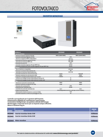 569FOTOVOLTAICOINVERTER MONOFASEMODELLO05234420523443Ingresso (PV DC)Potenza massima ingresso PV(W)6000 (3000/3000)9600 (4800/4800)Tensione nominale ingresso PV(V)Numero di ingressi MPPT indipendentIntervallo di tensione ingresso PV(V)Intervallo di tensione MPPT(V)Tensione di avvio (V)Corrente massima ingresso PVper MPPT(A)Corrente massima di corto circuito ingresso PVper MPPT(A)BatteriaTipo di batteria compatibileTensione nominale della batteria(V)Intervallo di tensione della batteria(V)Corrente massima di carica/scarica (A)70/70140/140Potenza massima di carica/scarica (W)30006000Capacit%u00e0 consigliata della batteriaper inverter>100AH>200AHFunzione di risveglio forzato della batteria tramite PVFunzione di risveglio forzato della batteria tramite reteRetePotenza di uscita AC nominale(W)30006000Potenza massima di ingresso AC(VA)45009000Tensione AC nominale(V)Frequenza AC nominale(Hz)Corrente di uscita AC nominale(A)13.526.5Fattore dipotenza(PF)Distorsione armonica totale in corrente(THDI)Corrente massima continua dipassaggio AC(A)UPSSi3202/(1:1)120~450120~38510017/1725/25Litio-Ion4838.4~6035Si23050/600.99 (Regolabile da 0.8 in anticipo a 0.8 in ritardo)<5%MeterControllo e personalizzato per la gestione dell%u2019impianto.Alimentazione affidabile per massimizzare l%u2019autoconsumo.Connessione intelligente per una gestione ottimale dell%u2019energia.Monitoraggio e interventi tecnici per un impianto sempre efficiente.Messa in funzione Plug-In.CODICEDESCRIZIONEPREZZO%u20ac0523442Inverter monofase ibrido 3 kWrichiesta0523443Inverter monofase ibrido 6 kWrichiesta0523444Meter monofaserichiestaPer tutte le schede tecniche e dichiarazioni di conformit%u00e0: www.divisionenergy.com/prodotti/