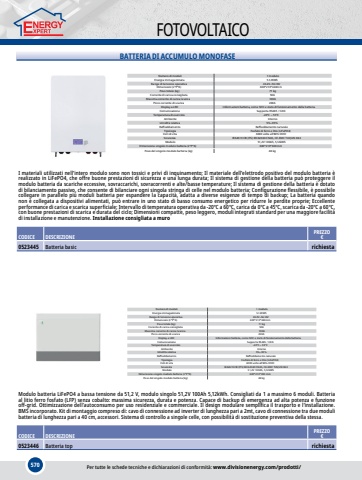 570FOTOVOLTAICOBATTERIA DI ACCUMULO MONOFASENumerodimodul1 moduloEnergiaimmagazzinata512KWhRangeditensioneoperativa43.2V~5616VDimensioni(L*P*A)600*210*440mmPesototale(kg)71 kgCorrentedicarcaconsigliata50AMassimacorrentedicarica/scarica100APiccocorrentediscarica200ADisplaya LEDInformazionibatteria, comeSOCestatodifunzionamentodellabatteria.ComunicazioneSupportaRS485 / CANTemperaturadiesercizio20%u00b0C~ 55%u00b0CAmbienteInternoUmidt%u00e0relativa5%~95%RafireddamentoRafireddamentonaturaleTipologiaFosfatodiferroetio(LFePO4)Ciclidivita6000volteall80% DODSicurezzaIE62619CB(ITS)IEC62040CNAS, CE-EMC TUVUN 383Modulo51,2V 100Ah, 5,12kWhDimensionesingolomodulobatteria(L*P*A)600*210*300mmPesodelsingolomodulobatteria(kg)48kgI materiali utilizzati nell%u2019intero modulo sono non tossici e privi di inquinamento; Il materiale dell%u2019elettrodo positivo del modulo batteria %u00e8 realizzato in LiFePO4, che offre buone prestazioni di sicurezza e una lunga durata; Il sistema di gestione della batteria pu%u00f2 proteggere il modulo batteria da scariche eccessive, sovraccarichi, sovracorrenti e alte/basse temperature; Il sistema di gestione della batteria %u00e8 dotato di bilanciamento passivo, che consente di bilanciare ogni singola stringa di celle nel modulo batteria; Configurazione flessibile, %u00e8 possibile collegare in parallelo pi%u00f9 moduli batteria per espandere la capacit%u00e0, adatta a diverse esigenze di tempo di backup; La batteria quando non %u00e8 collegata a dispositivi alimentati, pu%u00f2 entrare in uno stato di basso consumo energetico per ridurre le perdite proprie; Eccellente performance di carica e scarica superficiale; Intervallo di temperatura operativa da -20%u2103 a 60%u2103, carica da 0%u2103 a 45%u2103, scarica da -20%u2103 a 60%u2103, con buone prestazioni di scarica e durata del ciclo; Dimensioni compatte, peso leggero, moduli integrati standard per una maggiore facilit%u00e0 di installazione e manutenzione. Installazione consigliata a muroCODICEDESCRIZIONEPREZZO%u20ac0523445Batteria basicrichiestaNumerodimodul1 moduloEnergiaimmagazzinata5.12KWhRangeditensioneoperativa432V~5616VDimensioni(L*P*A)600*210*440mmPesototale(kg)71 kgCorrentedicarcaconsigliata50AMassimacorrentedicarica/scarica100APiccocorrentediscarica200ADisplaya LEDInformazionibatteria, comeSOCestatodifunzionamentodellabatteriaComunicazioneSupportaRS485 / CANTemperaturadiesercizio20%u00b0C 55%u00b0CAmbienteInternoUmidt%u00e0relativa5%~95%RafireddamentoRafireddamentonaturaleTipologiaFosfatodiferroelitio(LiFePO4)Ciclidivita6000voteall%u201980% DODSicurezzaIE62619CB(ITS)IEC62040CNAS, CE-EMC TUV,UN 38.3Modulo51,2V 100Ah, 5,12kWhDimensionesingolomodulobatteria(L*P*A)600*210*300mmPesodelsingolomodulobatteria(kg)48kgModulo batteria LiFePO4 a bassa tensione da 51,2 V, modulo singolo 51,2V 100Ah 5,12kWh. Consigliati da 1 a massimo 6 moduli. Batteria al litio ferro fosfato (LFP) senza cobalto: massima sicurezza, durata e potenza. Capace di backup di emergenza ad alta potenza e funzione off-grid. Ottimizzazione dell%u2019autoconsumo per uso residenziale e commerciale. Il design modulare semplifica il trasporto e l%u2019installazione. BMS incorporato. Kit di montaggio compreso di: cavo di connessione ad inverter di lunghezza pari a 2mt, cavo di connessione tra due moduli batteria di lunghezza pari a 40 cm, accessori. Sistema di controllo a singole celle, con possibilit%u00e0 di sostituzione preventiva della stessa.CODICEDESCRIZIONEPREZZO%u20ac0523446Batteria toprichiestaPer tutte le schede tecniche e dichiarazioni di conformit%u00e0: www.divisionenergy.com/prodotti/