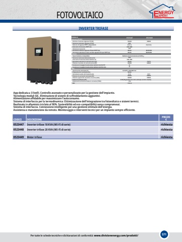 571FOTOVOLTAICOINVERTER TRIFASEMODELLO05234470523448Ingresso (PV DC)Potenza massima ingresso PV(W)15000 30000Tensione nominale ingresso PV(V)Numero di ingressi MPPT indipendent2/(1:1) 3/(2:2:2)Intervallo di tensione MPPT(V)Tensione di avvio (V)Corrente massima ingresso PVper MPPT(A)20/20 40/40/40Corrente massima di corto circuito ingresso PVper MPPT(A)25/25 50/50/50BatteriaTipo di batteria compatibileTensione nominale della batteria(VIntervallo di tensione della batteria(V)Corrente massima di carica/scarica(A)50/50 75/75Potenza massima di carica/scarica(W)10000 20000Funzione di risveglio forzato della batteria tramite PVFunzione di risveglio forzato della batteria tramite reteReteTensione AC nominale(V)Frequenza AC nominale(Hz)Corrente di uscita AC massima (A)21.843.5Potenza di uscita AC nominale(W)10000 20000Potenza apparente massima in uscita(kVA)10000 20000Fattore dipotenza(PF)Distorsione armonica totale in corrente (THDI)DC220~8003L/N/PE, 230/400 Vac50/600.99 (Regolabile da 0.8 in anticipo a 0.8 in ritardo)<3%Si690120Batterie ad alta tensione (LiFePO%u2084400100~800< 5% InSiApp dedicata a 3 livelli. Controllo avanzato e personalizzato per la gestione dell%u2019impianto.Tecnologia moduli SIC. Eliminazione di sistemi di raffreddamento aggiuntivi.Alimentazione affidabile per massimizzare l%u2019autoconsumo.Sistema di interfaccia per la termodinamica: Ottimizzazione dell%u2019integrazione tra fotovoltaico e sistemi termici.Realizzato in alluminio riciclato al 90%. Sostenibilit%u00e0 ed eco-compatibilit%u00e0 senza compromessi.Sistema di interfaccia. Connessione intelligente per una gestione ottimale dell%u2019energia.Assistenza e manutenzione da remoto. Monitoraggio e interventi tecnici per un impianto sempre efficiente.CODICEDESCRIZIONEPREZZO%u20ac0523447Inverter trifase 10 KVA (WI-FI di serie)richiesta0523448Inverter trifase 20 KVA (WI-FI di serie)richiesta0523449Meter trifaserichiestaPer tutte le schede tecniche e dichiarazioni di conformit%u00e0: www.divisionenergy.com/prodotti/