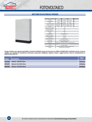 572FOTOVOLTAICOBATTERIE DI ACCUMULO TRIFASECodiceModello 153.6V50Ah204.8V50Ah256V50AhNumerodilivell345Capacit%u00e0 7.68KWh1024KWh12.8KWhRangeTensione Operativa1344V-168.48V1792V-224.64V 224V-2808VDimensioni(L*L*A)mm600*210*870 600*210*1030600*210*1190Peso(Kg)10251291555Correntedicarcaconsigliata25AMaxcorrentedicarca50AMaxcorrentediscarica50APiccocorrentelOOA/lDisplaysocComunicazioneSupportaRS485 / CANTemperatura operativa~20%u00b0C~55%u00b0CAmbiente di installazioneInternoUmidt%u00e0 relativa5%~95%Modalit%u00e0 di rafireddamentoConvezioneNaturaleTecnologiacellaLithium-ironphosphate(LFeP04)Ciclodivtautile6000vote@80%D0DCertiffcazioniCB, IEC62619, CE-EMC, CE-GPSD, UKCA, UL1973, UL9540A, IEC/EN62040; UN38.3, MSDSSpeciffchetecnichemodulosingoloModulo512V 50Ah, 256kWhDimensioni(L*L*A)mm HghVotageBox:600*210*250BatteryBox600*210*160Peso(Kg)HighVotageBox:14BatteryBox:28052345005234510523452Design modulare con capacit%u00e0 espandibile. Prestazioni affidabili, lunga vita lavorativa con 6000 cicli @80% DOD. Installazione facile, struttura impilata con modalit%u00e0 di installazione ottimizzata. Operazioni intelligente, diagnosi remota e aggiornamento. Ricarica completamente la batteria entro due ore.CODICEDESCRIZIONEPREZZO%u20ac0523450Batteria 7,68 kW trifaserichiesta0523451Batteria10,24 kWtrifaserichiesta0523452Batteria12,80 kWtrifaserichiestaPer tutte le schede tecniche e dichiarazioni di conformit%u00e0: www.divisionenergy.com/prodotti/